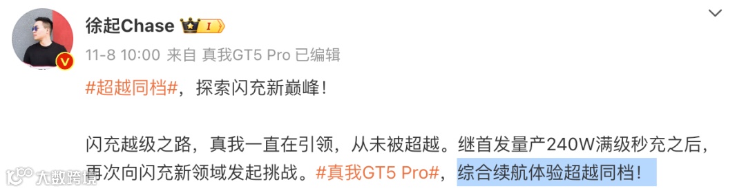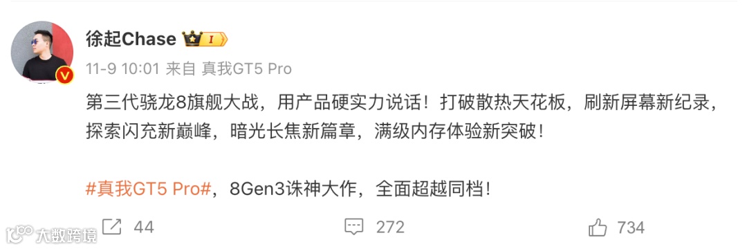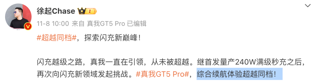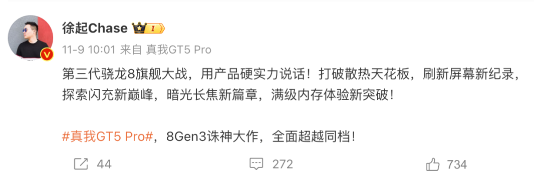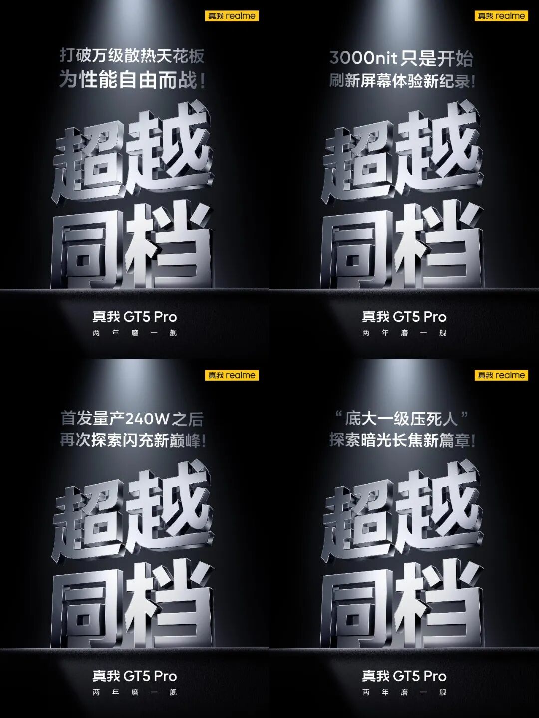 realme副总裁、全球营销总裁、中国区总裁徐起之前还在微博发布了多张海报,表示真我GT5 Pro将在散热、屏幕、闪充、续航、长焦等方面超越同档,有在等的吗?