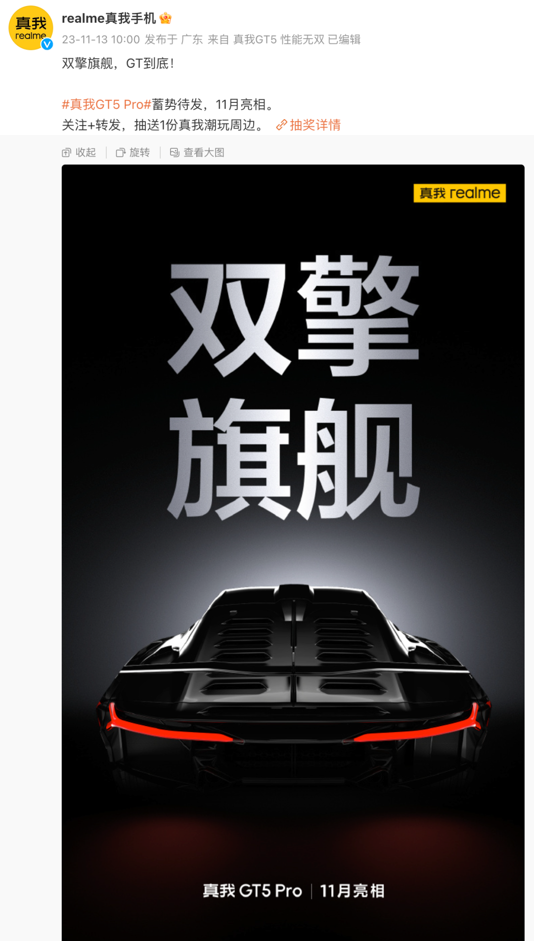 官方表示真我GT5 Pro蓄势待发,将于11月亮相。至于具体发布日期暂未提及,如果本月发布的话,似乎要比一加12早(网传一加12暂定12.5发布),如果本月亮相指的是像一加之前的预热活动比如部分技术媒体沟通会或外观揭晓等,那估计是12月发布,最终何时发布还有待进一步消息。