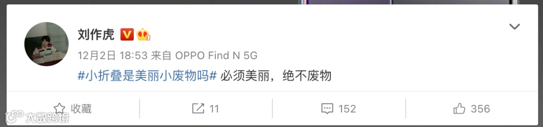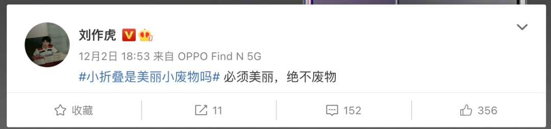 OPPO首席产品官 一加创始人刘作虎参与微博话题「小折叠是美丽小废物吗」表示“必须美丽,绝不废物”,应该正是暗示自家的首款竖折机不废物且美丽。