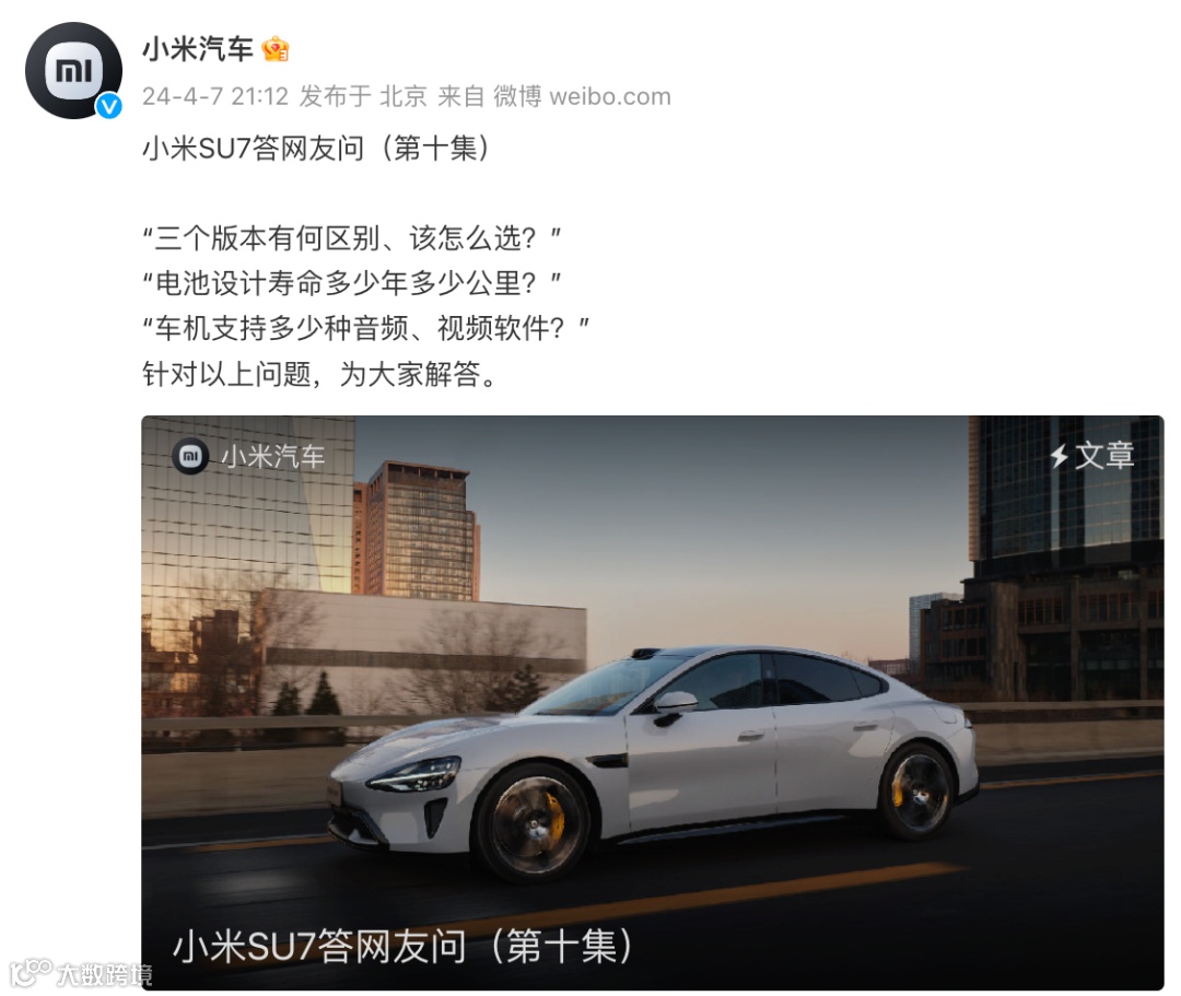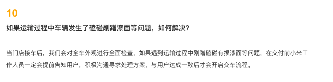 上图为小米汽车官方微博对运输过程中车辆碰到磕碰剐蹭漆面等问题的介绍