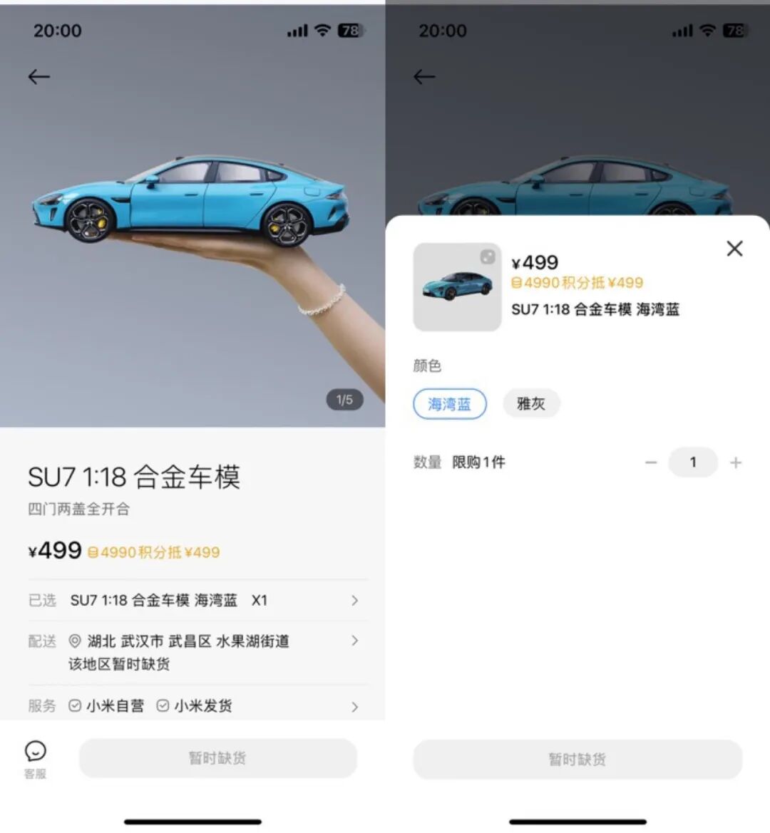 3月28日,小米SU7系列正式发布,伴随着汽车的正式发布,小米汽车App也上架了小米SU7的1:18合金车模,海湾蓝、雅灰2个配色可选,售价499元,但当天秒没,昨日官方在下午预告4月7日20点补货,但再度秒没。