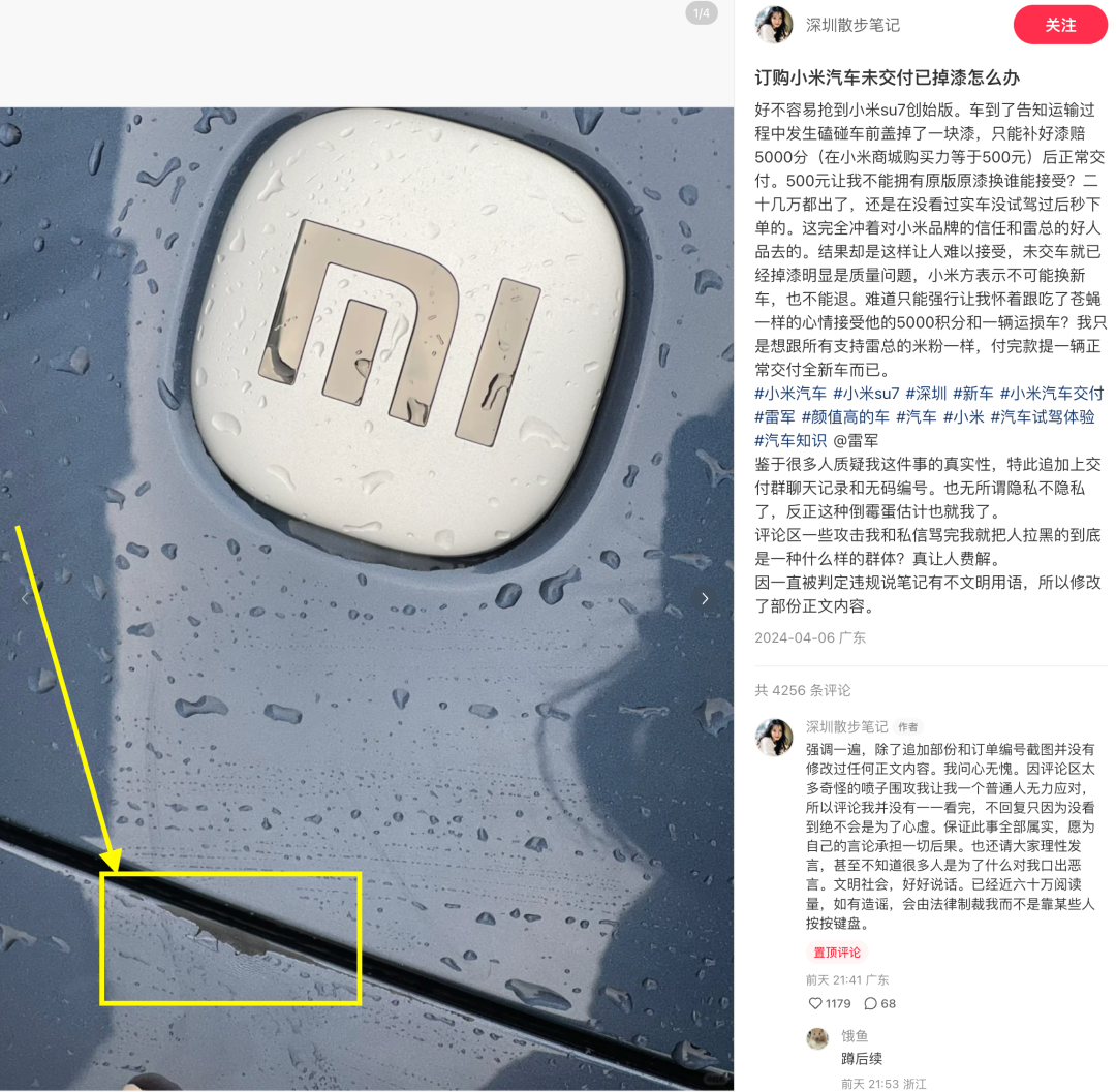 另一边关于小米SU7昨日还有条新闻引发热议。如上图所见,有一位编号为3663的小米SU7创始版车主发笔记表示好不容易抢到,结果车到了被告知运输过程中发生磕碰车前盖掉了一块漆,只能补好漆赔5000积分(在小米商城购买力等于500元)后正常交付。莫女士拒绝后,对方提出赔最高20000积分的解决方案,不支持更换新车,退车定金也没法退,再次被莫女士拒绝。莫女士坚持要求更换新车。