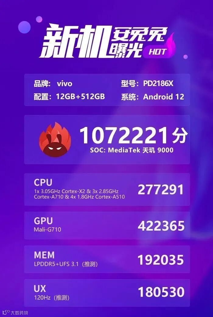 其表示vivo这款新机是后台里看到的最早一款使用量产机代号跑分的机型,1072221分也是目前所有搭载天玑9000机型中,截至目前的最高分。(小白测评在去年底拿到天玑9000工程机测试的安兔兔跑分是1009087,vivo这款直接高出了近7万分,虽然不排除和储存规格有关系的缘故,但确实挺高的。)