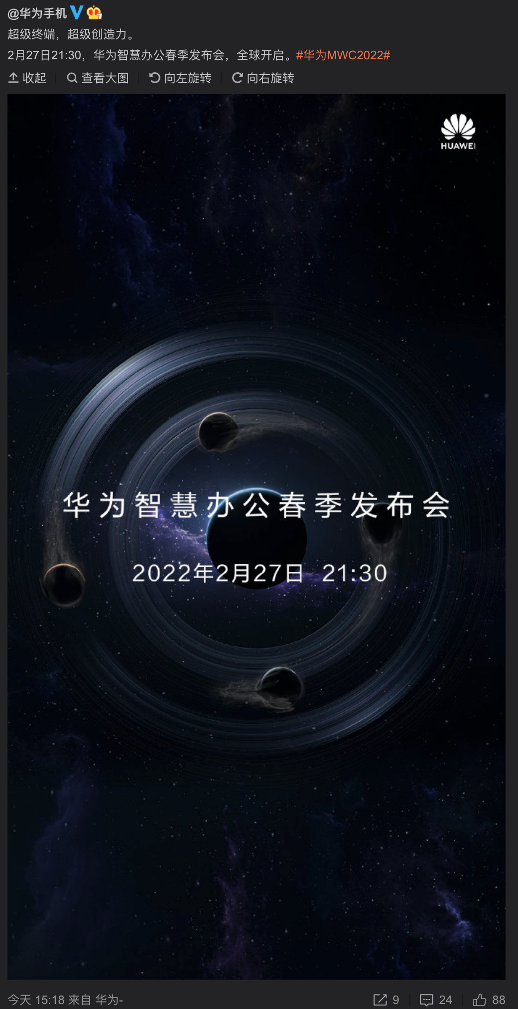 华为手机官方预热将于2月27日21:30举行华为智慧办公春季发布会,全球开启,具体暂时不清楚有哪些新品,但既然是「智慧办公」,应该主要是笔记本电脑(目前有华为MateBook D15等新品曝光),平板电脑是否会出新还真不好说,坐等下周揭晓吧~