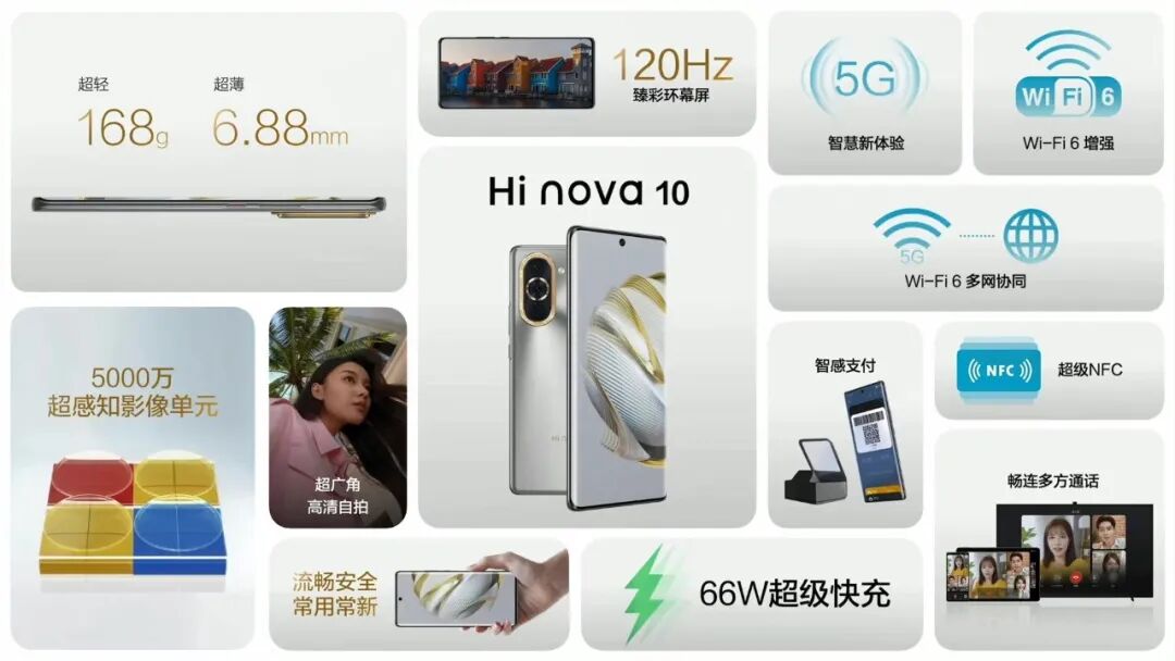基础配置上,Hi nova 10 Pro 5G采用6.78英寸2652*1200分辨率的OLED左上角双挖孔曲面屏,120Hz刷新率,300Hz触控采样率,提供10号色、曜金黑、普罗旺斯、绮境森林4个配色;机身厚约7.88mm,重约191g;(Hi nova 10 5G是6.67英寸2400*1080分辨率的居中单挖孔屏,66W充电)