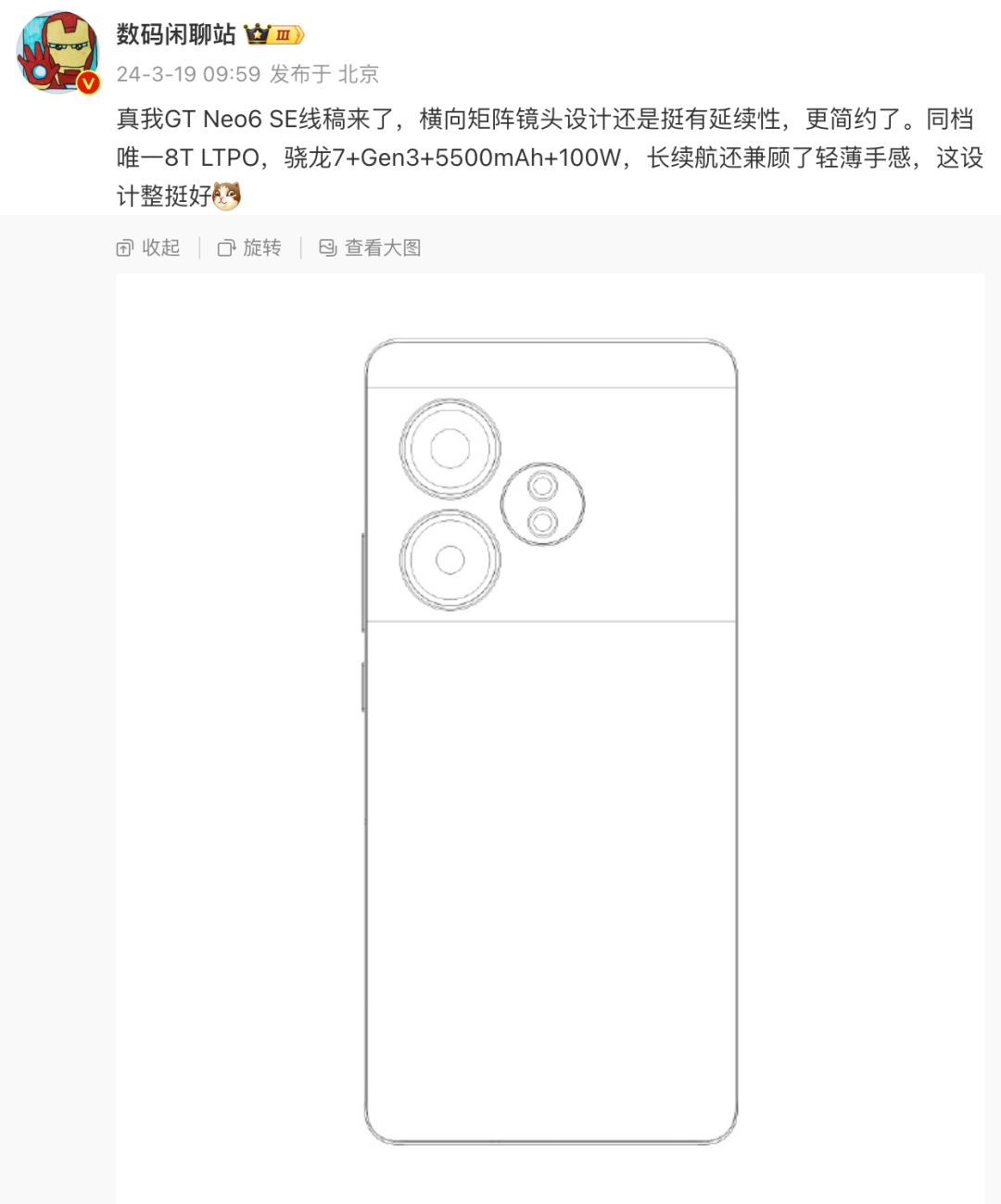 GT Neo6 SE已经率先预热将搭载骁龙7+ Gen3,今天外观也有消息了。