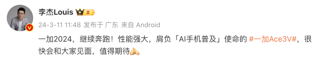 此外,一加中国区总裁李杰曾表示一加Ace3V肩负「AI手机普及」使命,爆料这次将全面下放AIGC、AndesGPT,可能是年轻人第一台AI手机,实测性能和功耗表现也很强,中端杀手。大家或许可以期待下~