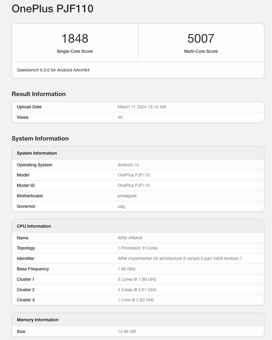 具体关于一加Ace3V可能首发搭载的这颗骁龙7+ Gen3处理器,Geekbench 6后台显示其单核跑分1848±,多核跑分在5000±,CPU规格为:1*Cortex-X4 2.8GHz、4*Cortex-A720 2.61GHz、3*Cortex-A520 1.9GHz。