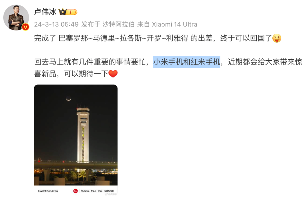 今天小米集团合伙人/总裁、国际部总裁、小米品牌总经理卢伟冰终于结束了海外出差,卢总表示回国后马上就有几件重要的事情要忙,小米手机和红米手机近期都会给大家带来惊喜新品。