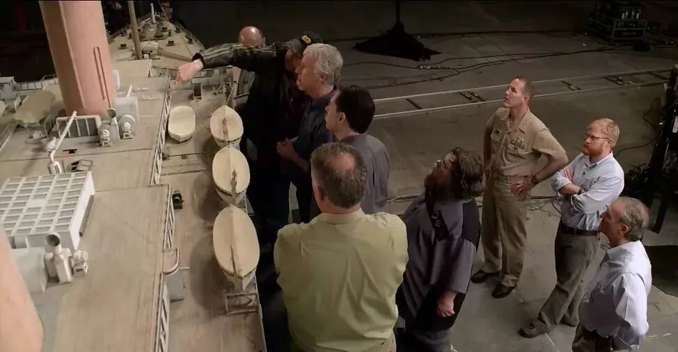 片中的泰坦尼克号,其实是一个长约250米的巨轮布景。卡梅隆让摄影师坐在汽车上,车朝着与巨轮布景相反的方向开,让人感觉是巨轮在海面开动。一旁的景物,自然也要做得足以衬托出泰坦尼克的“巨大”。为了让船舱看起来更开阔,卡梅隆对演员精挑细选:发动舱中工作的演员,身高都在1.5米左右。