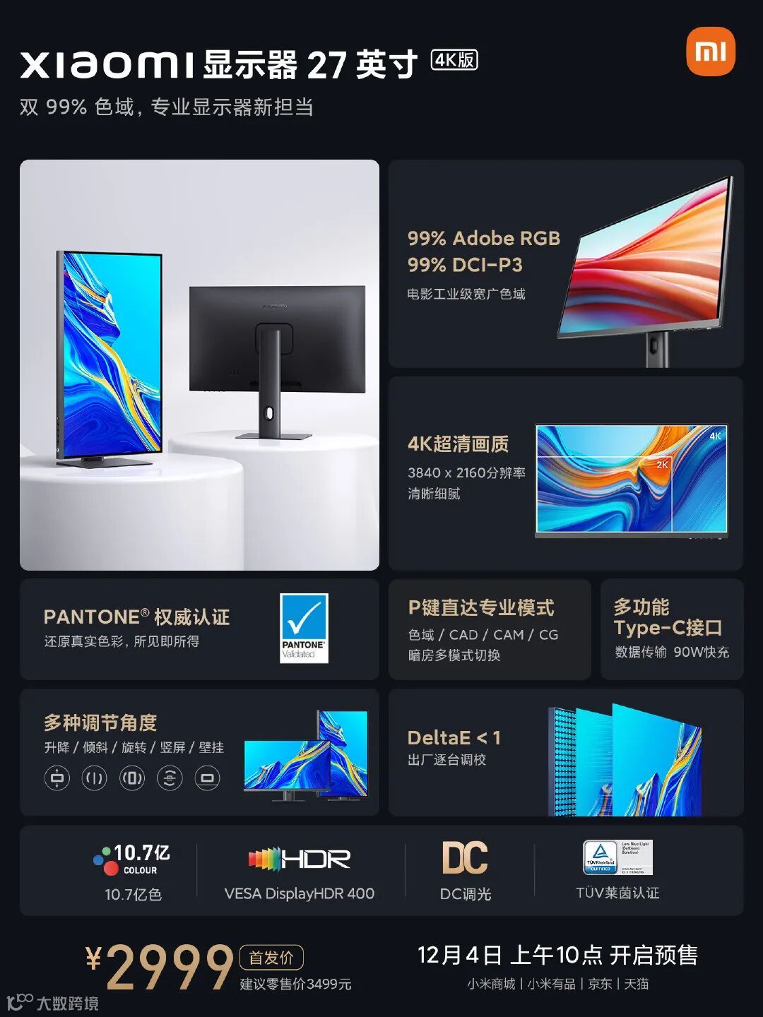 价格上,小米首款27英寸4K显示器售价3499元,首发价2999元,目前已经开启预售,将于12月12日正式开售。