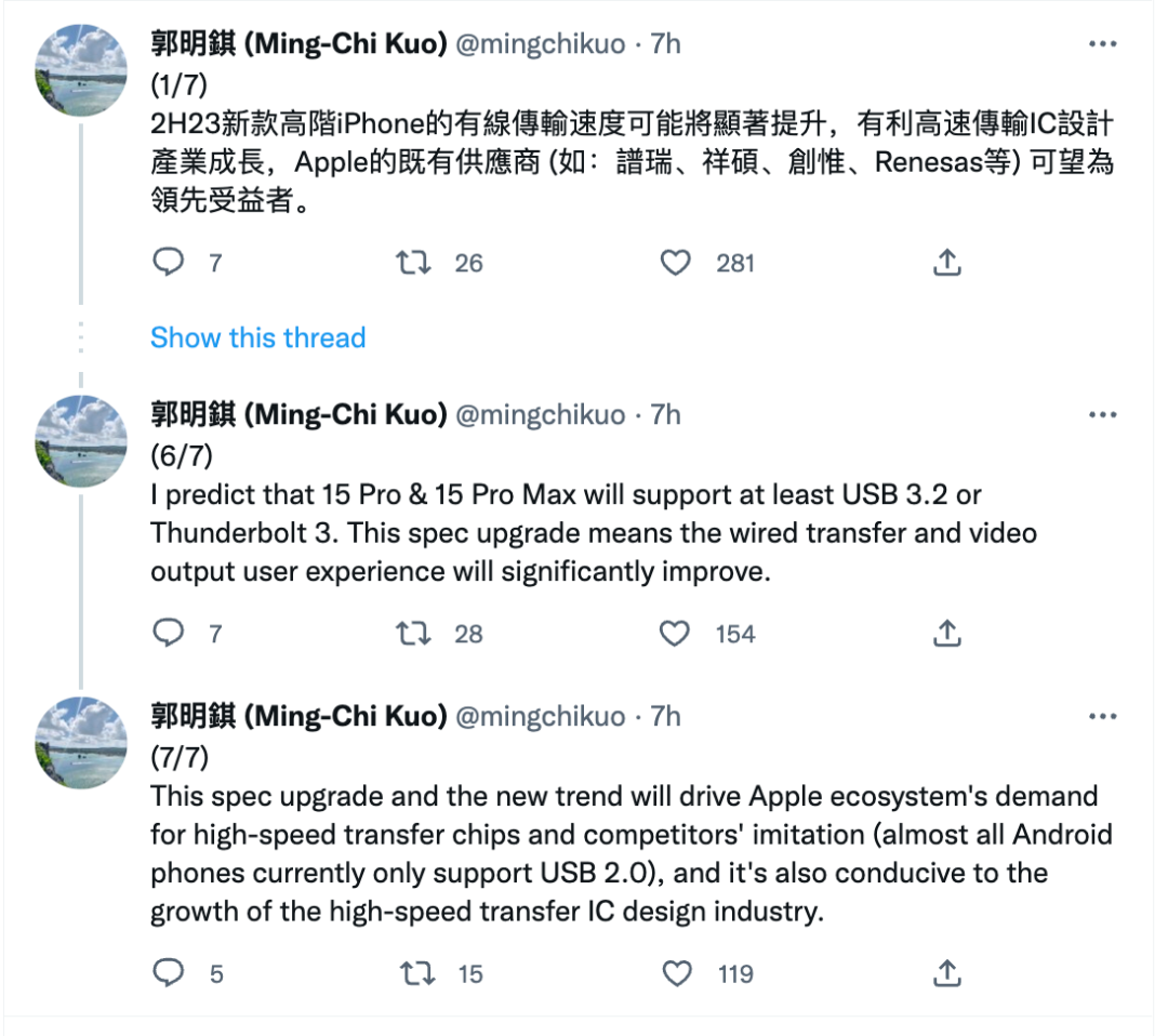 早前Apple全球营销副总裁Greg Joswiak确认:苹果将遵守新的欧盟法规将iPhone从Lightning接口换为USB-C。这也代表着明年的iPhone 15系列预计将采用USB-C接口。今天天风国际分析师郭明錤透露了新的信息。