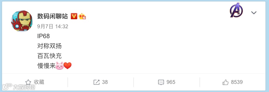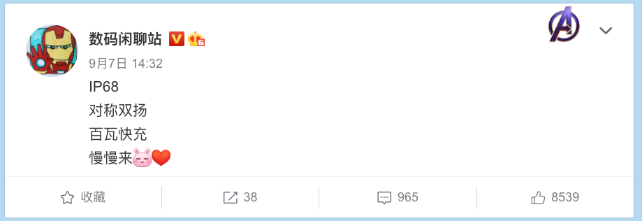 最后是Redmi新机这边的爆料,据爆料达人微博暗示,Redm新机将补足IP68防尘防水、百瓦快充,同时还有对称双扬。