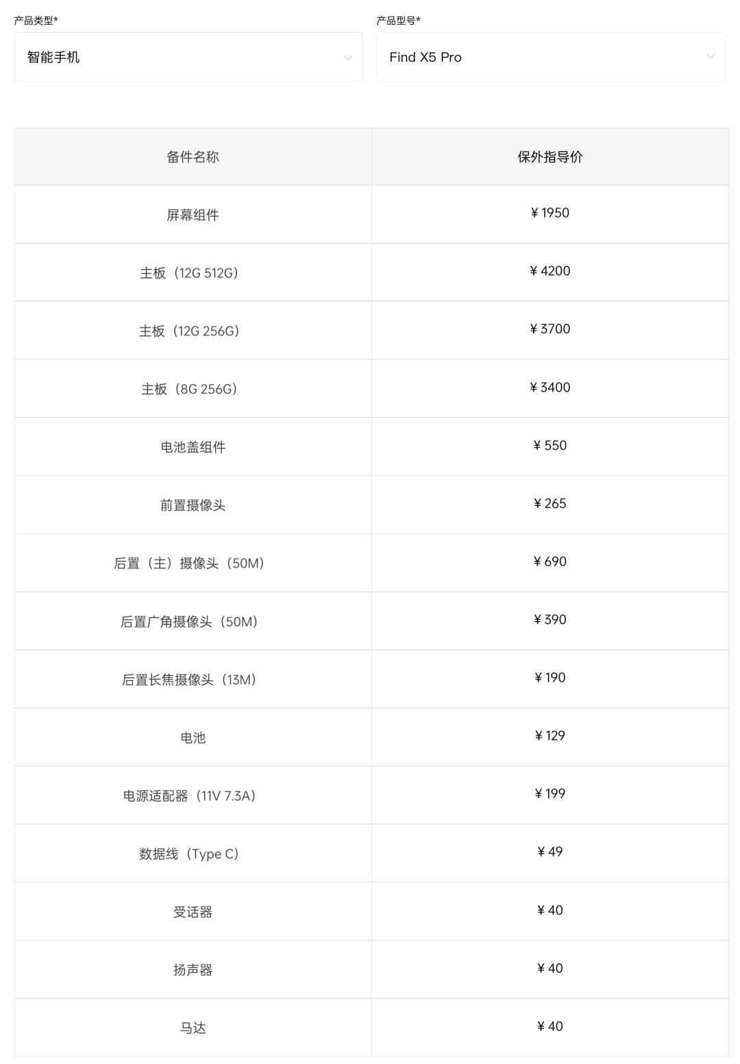 首发天玑9000的Find X5 Pro天玑版保外维修指导价:①屏幕组件1950元; ②12+256GB版 主板3400元;③电池盖组件550元;④前置摄像头265元;⑤后置主摄390元 50MP广角镜头390元 13MP长焦镜头190元;⑥电池129元;等。