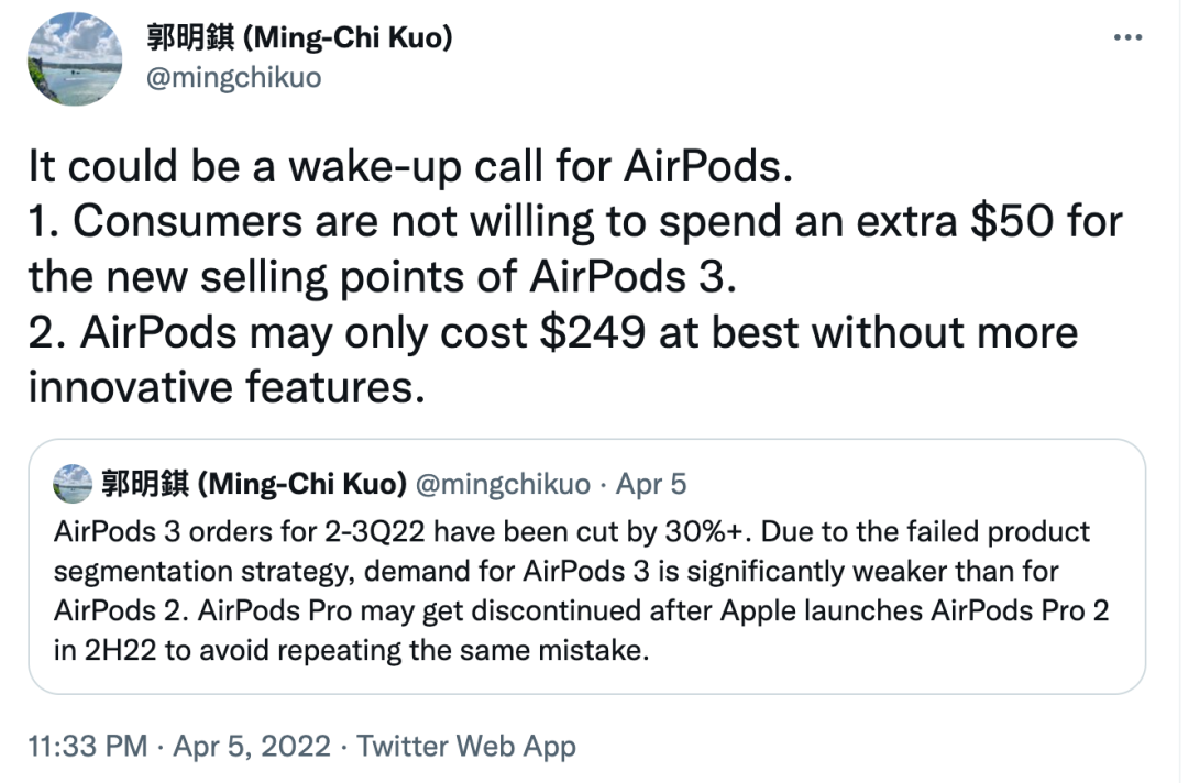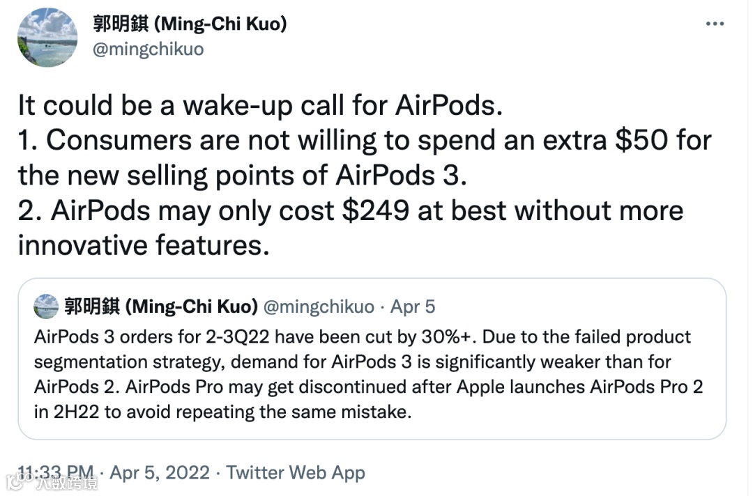 另外关于苹果这边,天风国际分析师郭明錤近日发表了最新预测,称AirPods 3由于产品细分策略失败,需求明显弱于AirPods 2,今年第二季度和第三季度的订单将减少约30%以上,苹果预计会在2022年下半年发布新款AirPods Pro 2,同时停产初代AirPods Pro。