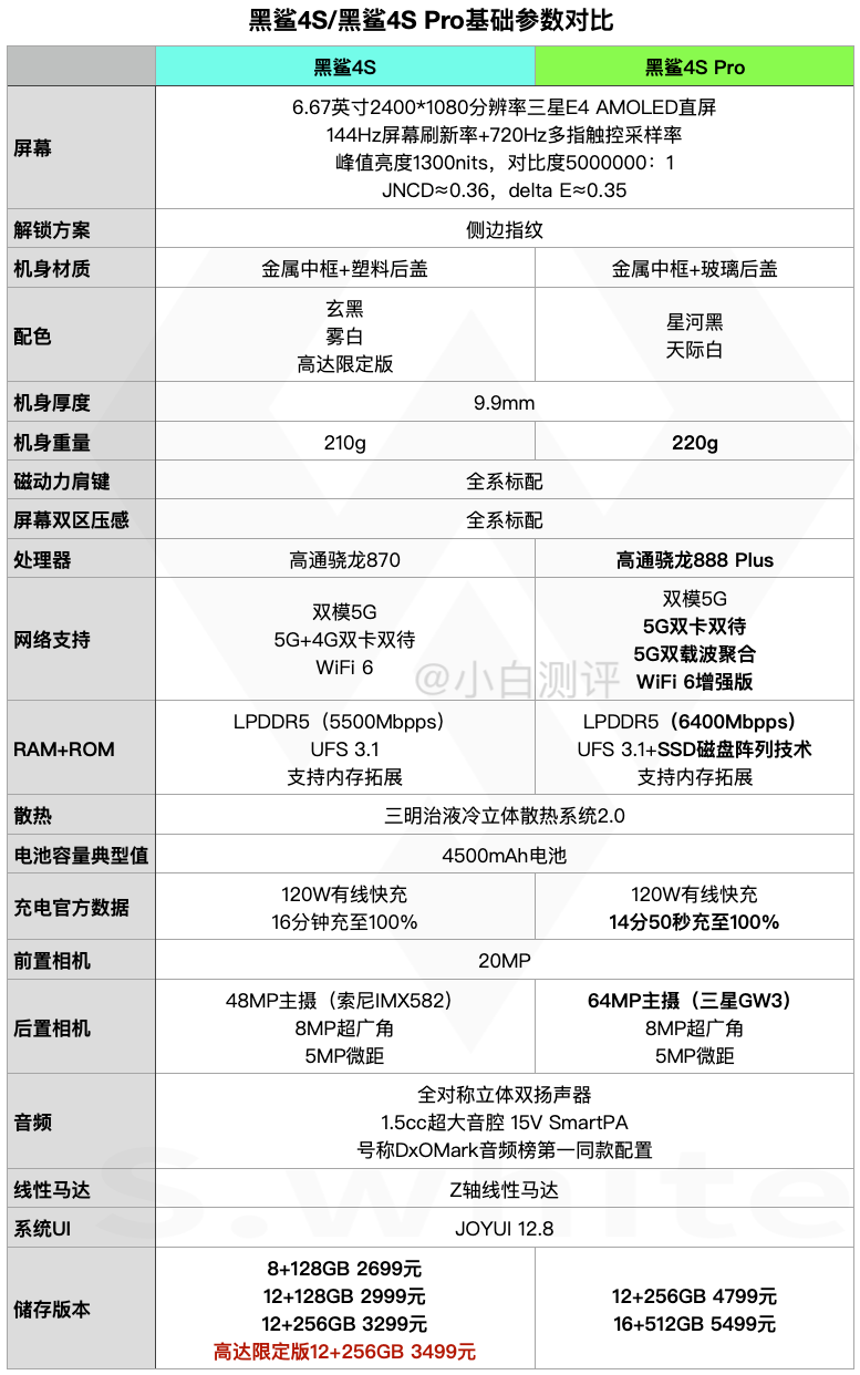 一图汇总对比下黑鲨4S和黑鲨4S Pro的主要参数。
