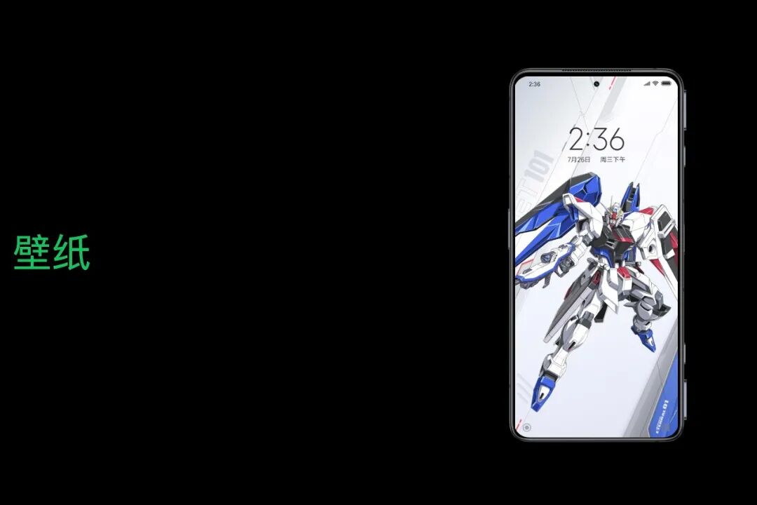 ,机身映刻自由高达经典红蓝配色,红色+蓝色双肩键,后置相机模组红蓝黑配色,机身后盖还有自由高达头像和扎夫特军标志,深度定制高达主题、开机动画、壁纸、主题UI等,还带来了高达限定版的凤鸣真无线蓝牙耳机、冰封制冷磁吸背夹、铠甲磁吸导热保护壳3款定制配件新品。