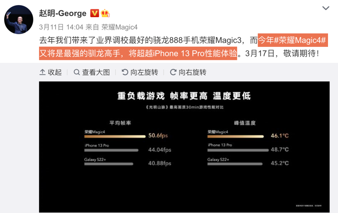 2月最后一天,荣耀在海外举行了Magic4系列全球发布会,发布了荣耀Magic4和Magic4 Pro两款旗舰,荣耀终端有限公司CEO赵明还预热称荣耀Magic4 Pro是“用户痛点终结者”,随后官方宣布国行发布会将于3月17日19:30举行。这几日官方也有陆续预热。