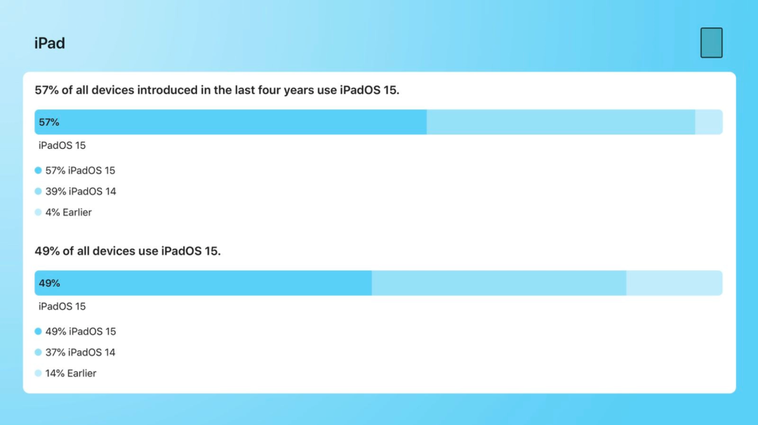 至于iPadOS,过去四年发布的设备里有57%用户升级了iPadOS 15,有39%的用户仍在使用iPadOS 14;如果算上四年前发布的设备,iPadOS 15安装率则为49%,差不多一半的占比。