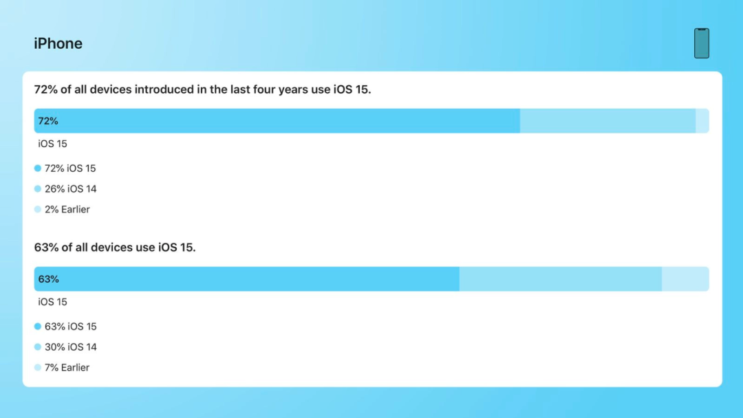 过去四年发布的设备中有72%用户已经安装升级使用了iOS 15