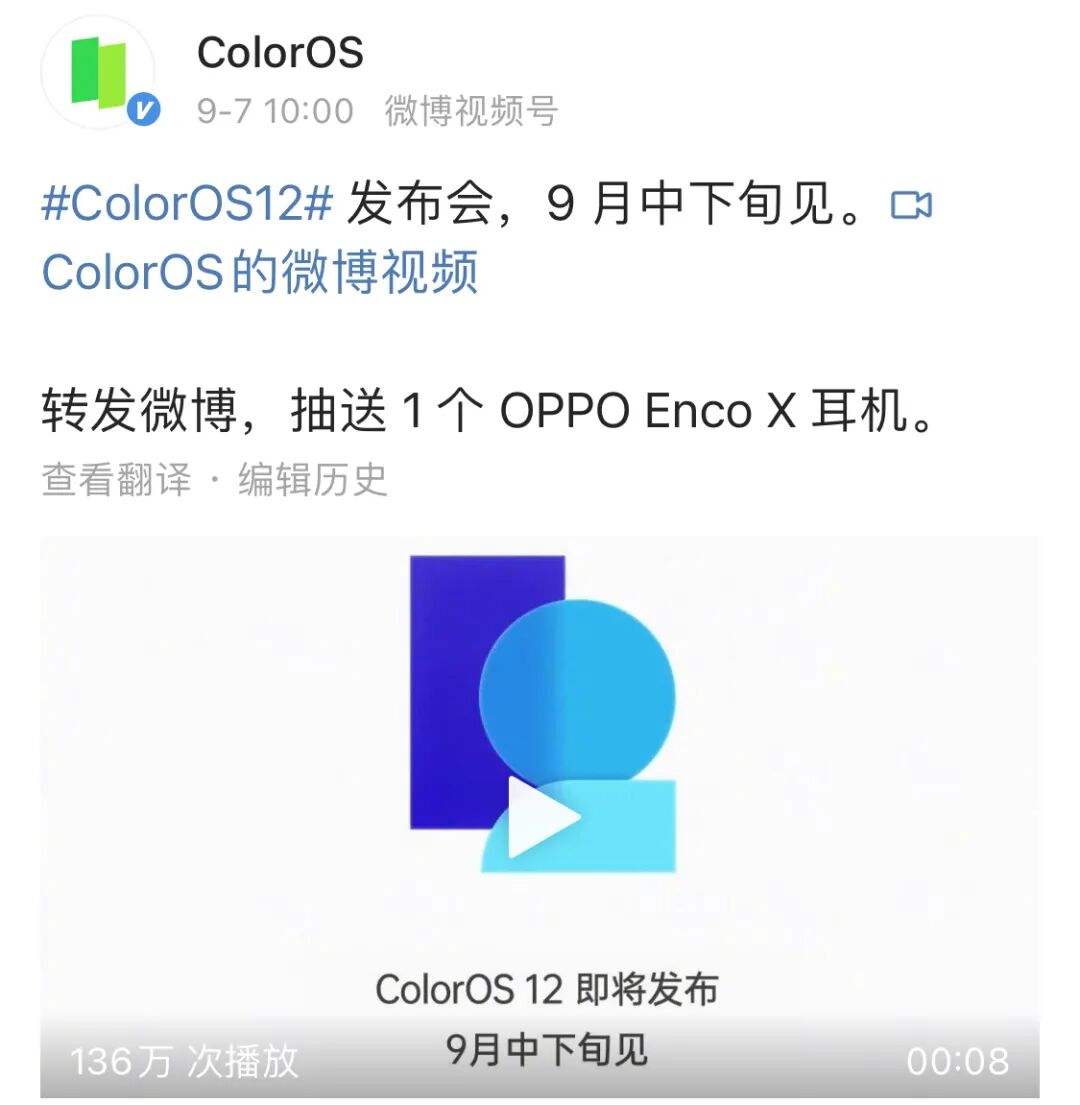 ColorOS12将于9月中下旬举办发布会。