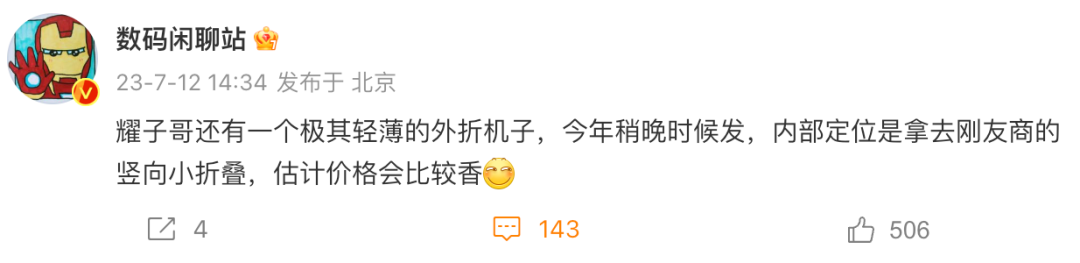 据数码闲聊站表示,荣耀有一台极其轻薄的外折方案新机,预计今年稍晚时候发布,内部定位是对标友商的竖向小折叠,估计价格会比较香。(拿横向外折去刚竖向小折叠总感觉有些奇怪🤔)