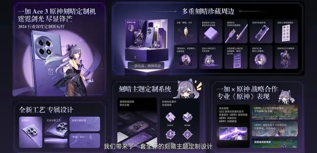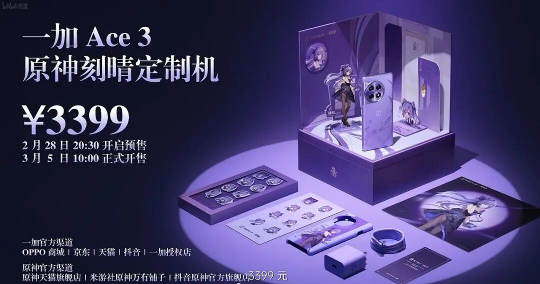 具体「一加Ace3原神刻晴定制机」礼盒内含:定制手机*1,原神刻晴主题的霆霓剑光100W超级闪充充电器、定制快充数据线、定制手机保护壳、「雷楔」卡针、Q版亚克力手机支架、亚克力立牌摆件、珍藏Q版纪念金属徽章8枚、马口铁叠闪人物徽章、定制Q版表情贴纸、主题海报、致旅行者的一封信。