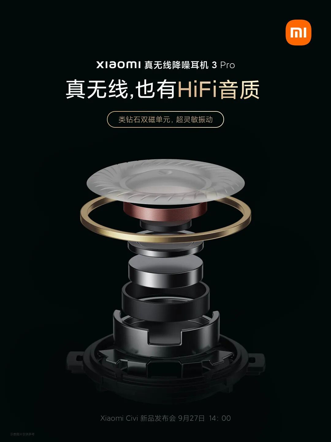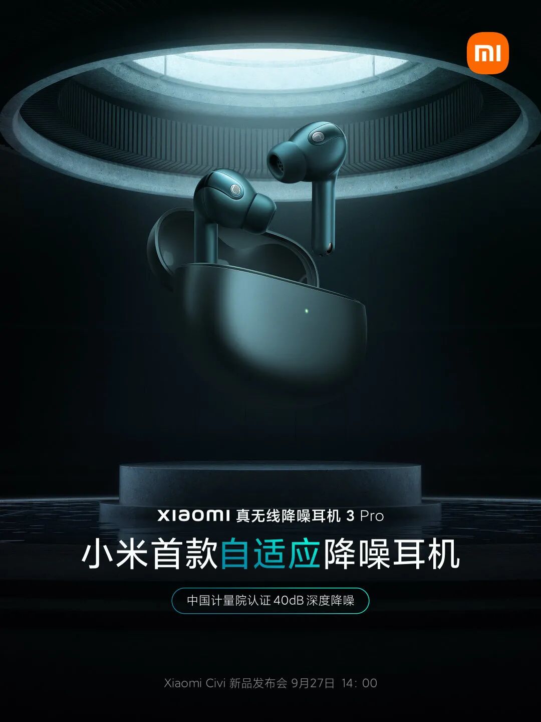 除了小米Civi新机外,据了解9月27日小米发布会还将发布小米首款自适应降噪耳机小米真无线降噪耳机 3 Pro。