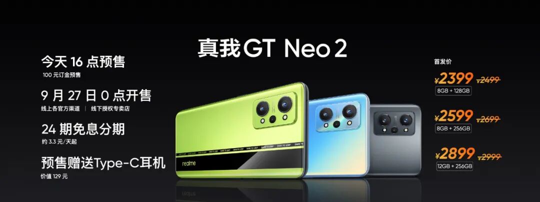 realme真我GT Neo2 8+128GB售价2499元 首发价2399元,8+256GB售价2699元 首发价2599元,12+256GB售价2999元 首发价2899元