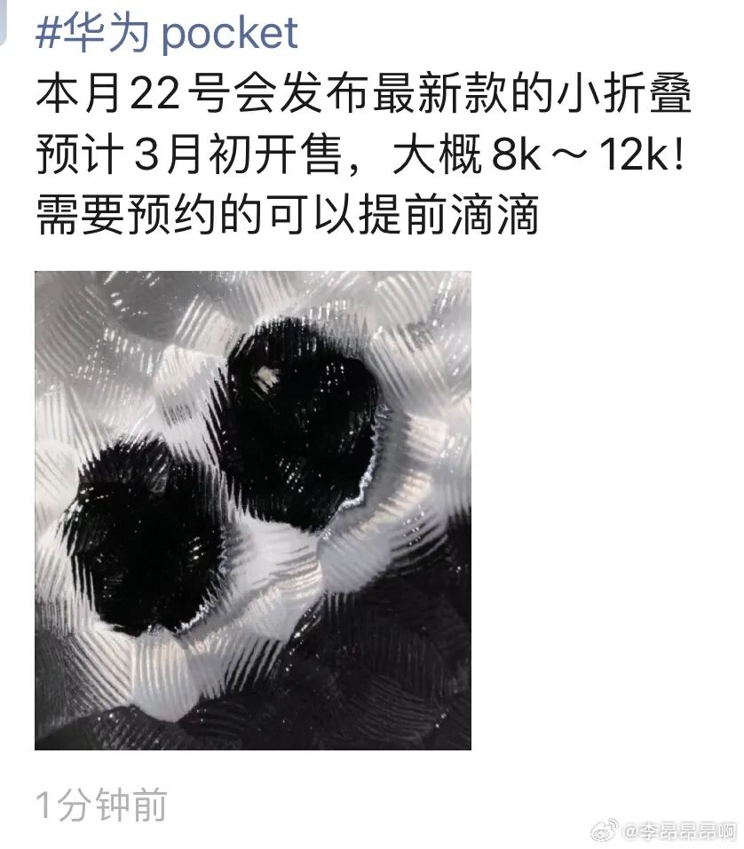 具体配置上,据爆料华为Pocket 2将搭载麒麟9000s处理器,主打轻薄旗舰小折叠,依然采用双圆镜设计。爆料还称预计3月初开售,价格在8K-12K左右。华为的小折叠已经许久没更新了,可以关注下这次的体验和最终价格。