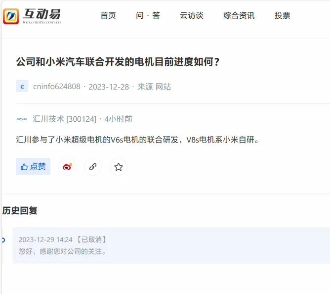 网传的深交所互动易平台截图显示,有投资者询问汇川技术“公司和小米汽车联合开发的电机目前进度如何”,汇川技术回复称:“汇川参与了小米超级电机 V6s 的联合研发,V8s 电机系小米自研。”