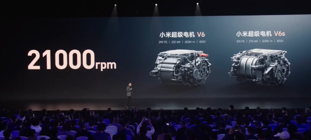 作为补充,雷军在发布会上曾介绍:小米超级电机V6/V6s已量产、并且会在首款汽车上车(21000rpm);27200rpm的V8s 2025年上车(介绍此处时提到“这个转速是全球最顶级的电机,刷新天花板”“由小米完全自研并且是由小米自己生产的”);另外实验室小米超级电机转子预研技术已实现35000rpm,暂无量产时间。