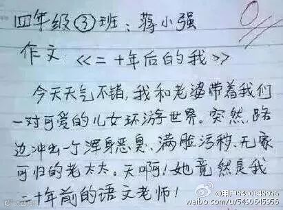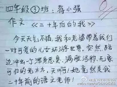 今天天气不错,我和老婆带着我们一对可爱的儿女环游世界。突然,路边冲出来一个浑身恶臭、满脸污秽、无家可归的老太太。天啊!她竟然是我二十年前的语文老师!