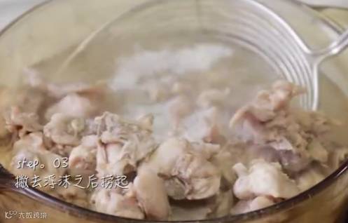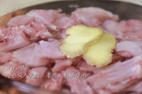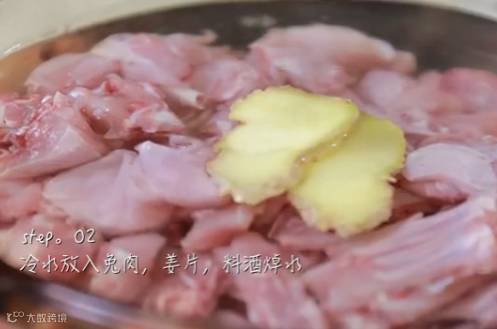 NO.2 冷水里放入兔肉、姜片、料酒,然后焯水~