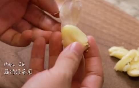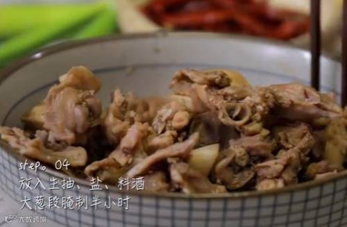 NO.4 放入生抽、盐、料酒、大葱段腌制半小时。