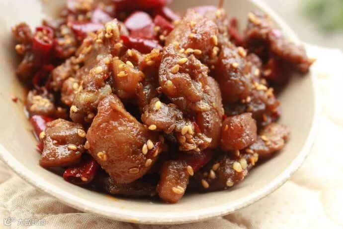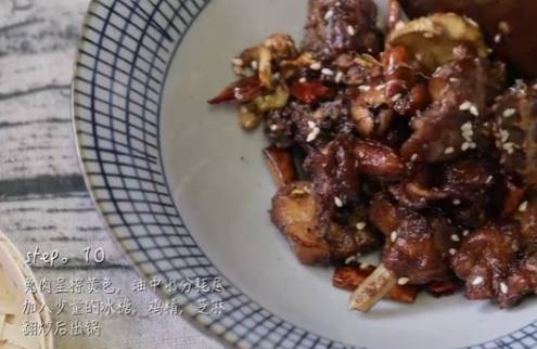 NO.10 兔肉呈棕黄色,油中水分耗尽后加入少量冰糖、鸡精、芝麻,翻炒均匀后就可以出锅啦~