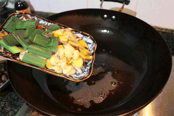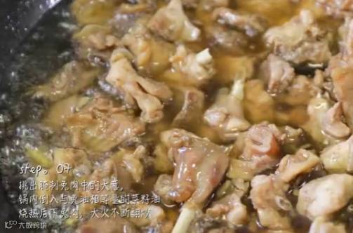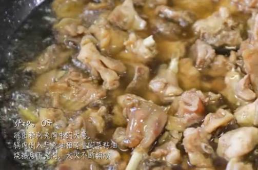NO.7 拍好备用挑出腌制兔肉中的大葱,国内倒入与兔油相等量的菜籽油,烧热后下兔肉,然后用大火不断翻炒。