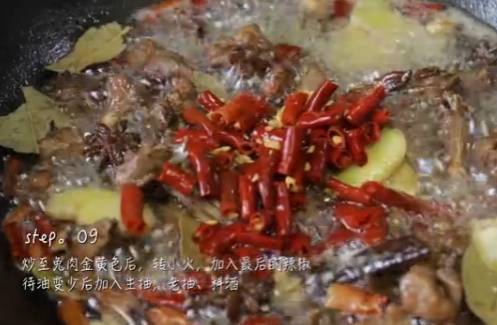 NO.9 炒至兔肉金黄色后,转小火,加入最后的辣椒,待油变少后加入生抽、老抽、料酒。