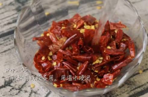 NO.5 把干辣椒剪成段备用,然后用温水浸泡。