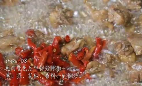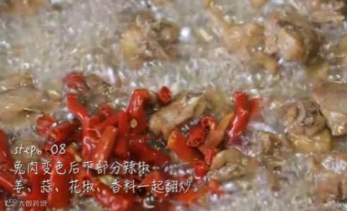 NO.8 兔肉变色后下部分辣椒,姜、蒜、辣椒、香料来一起翻炒。