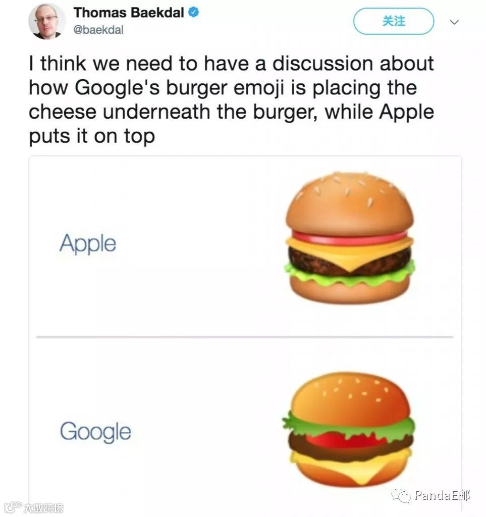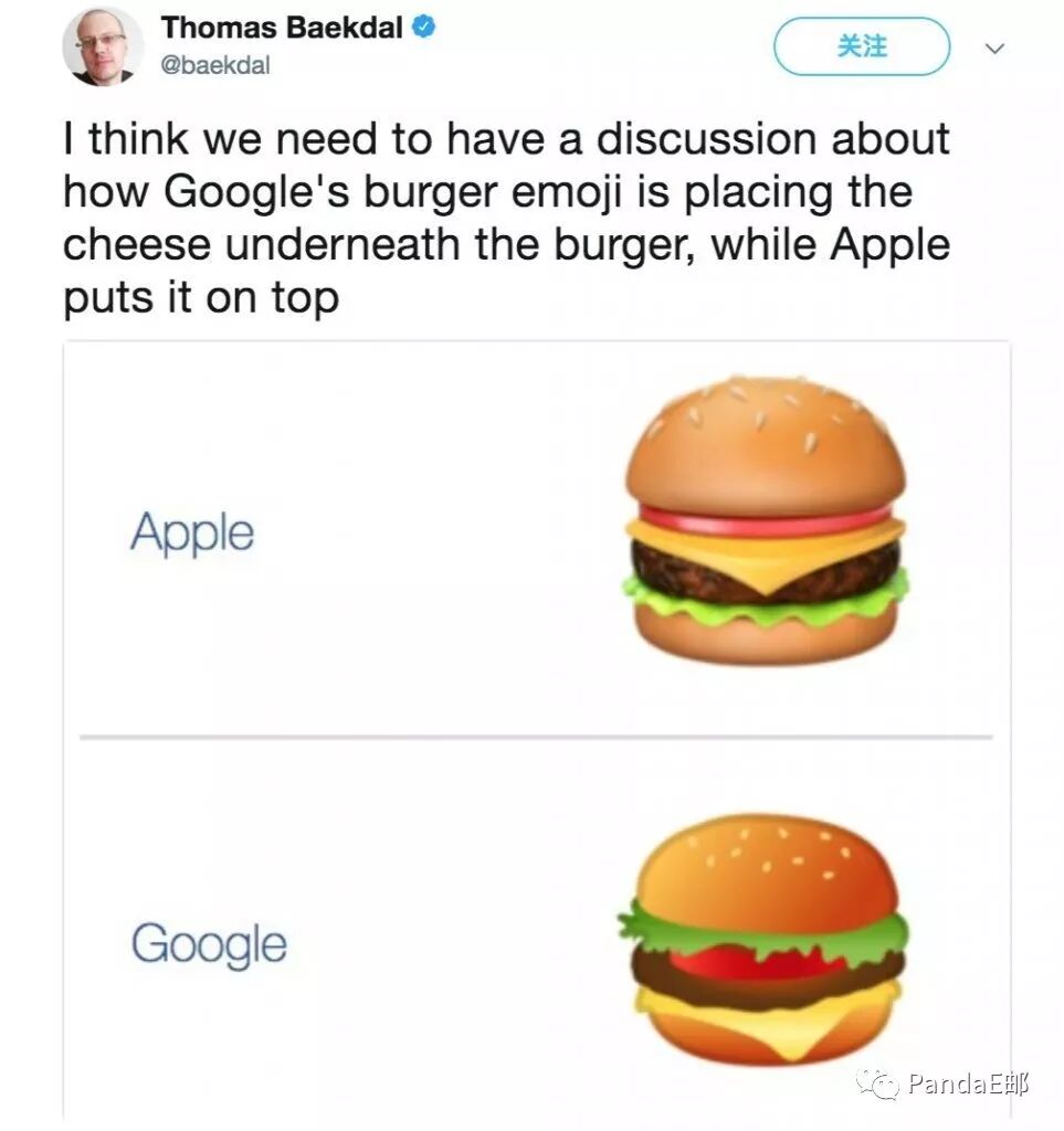 还有一些汉堡爱好者指出 Google 的汉堡 emoji 除了芝士的位置错了之外,生菜和西红柿也不应该被放在一起。而苹果的汉堡 emoji 也不是完美的,自下而上正确的顺序应该是面包-肉饼-各种素菜-面包。