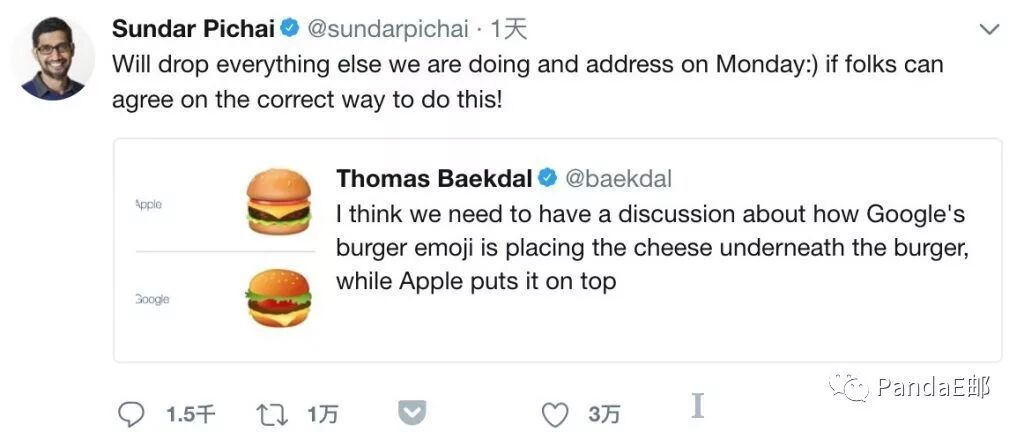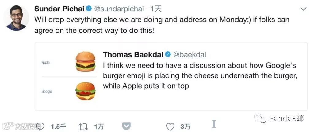 根据 Google CEO 的说法,现在全公司最优先级的工作是调整 Google 的汉堡 emoji。