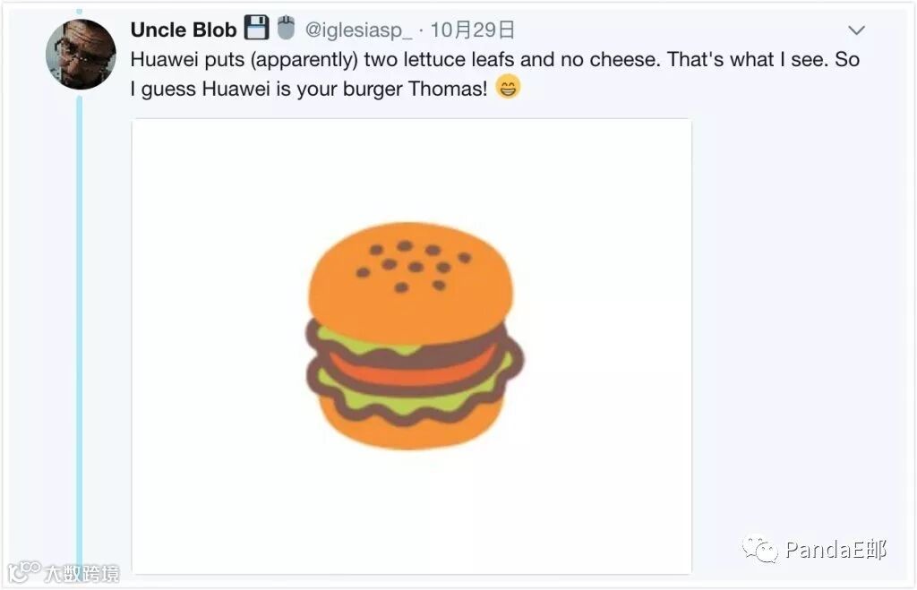 有趣的是,引发这次讨论的 Thomas Baekdal 本人其实是对芝士过敏的,因此有人就给他推荐了华为的汉堡 emoji,不带一点芝士。