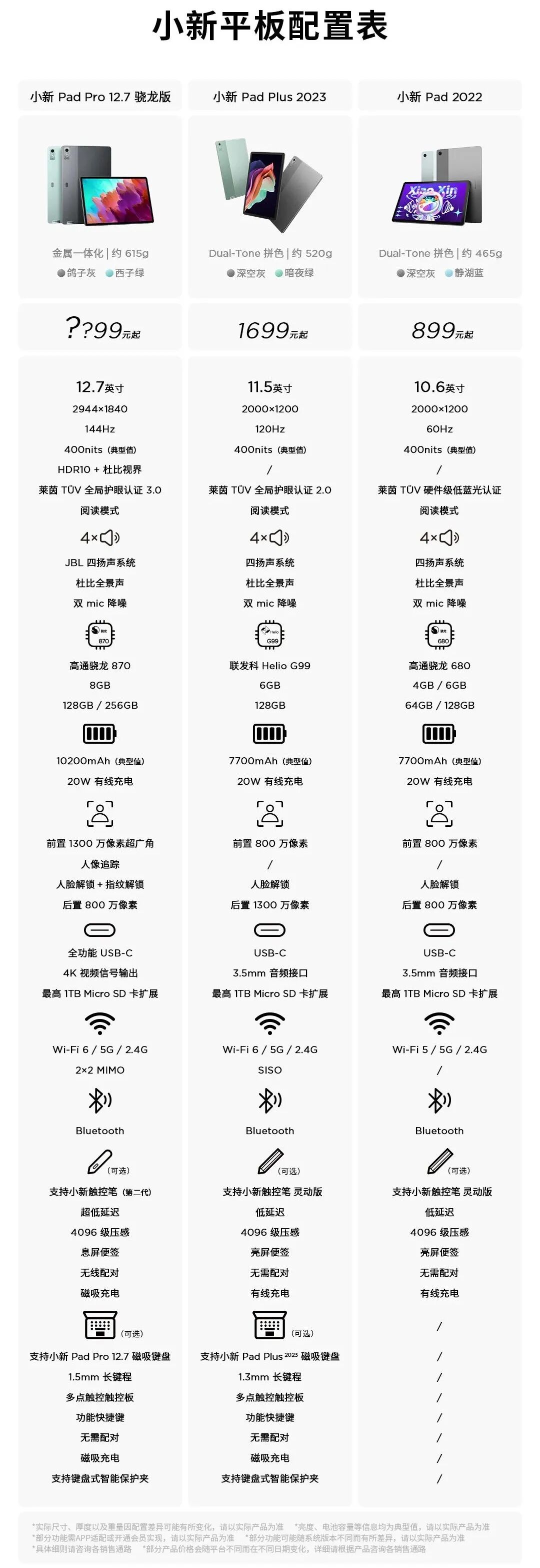 近日联想小新预热将于7月29日即明天在ChinaJoy展会发布多款新品,其中有两款为平板电脑,分别为小新Pad Pro 12.7、小新学习平板12.7英寸,今天官方直接公布了小新Pad Pro 12.7的配置表,来看看如何~