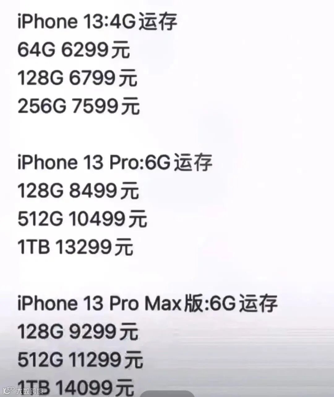 据网上流传的疑似经销商发布的价格表显示, iPhone 13售价或为6499元起,iPhone 13 Pro售价或为8499元起,iPhone 13 Pro Max售价或为9299元起,Pro/Max无256GB版本,13则无512GB版本,仅供大家参考吧~毕竟还没发布