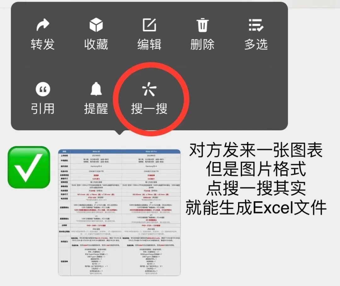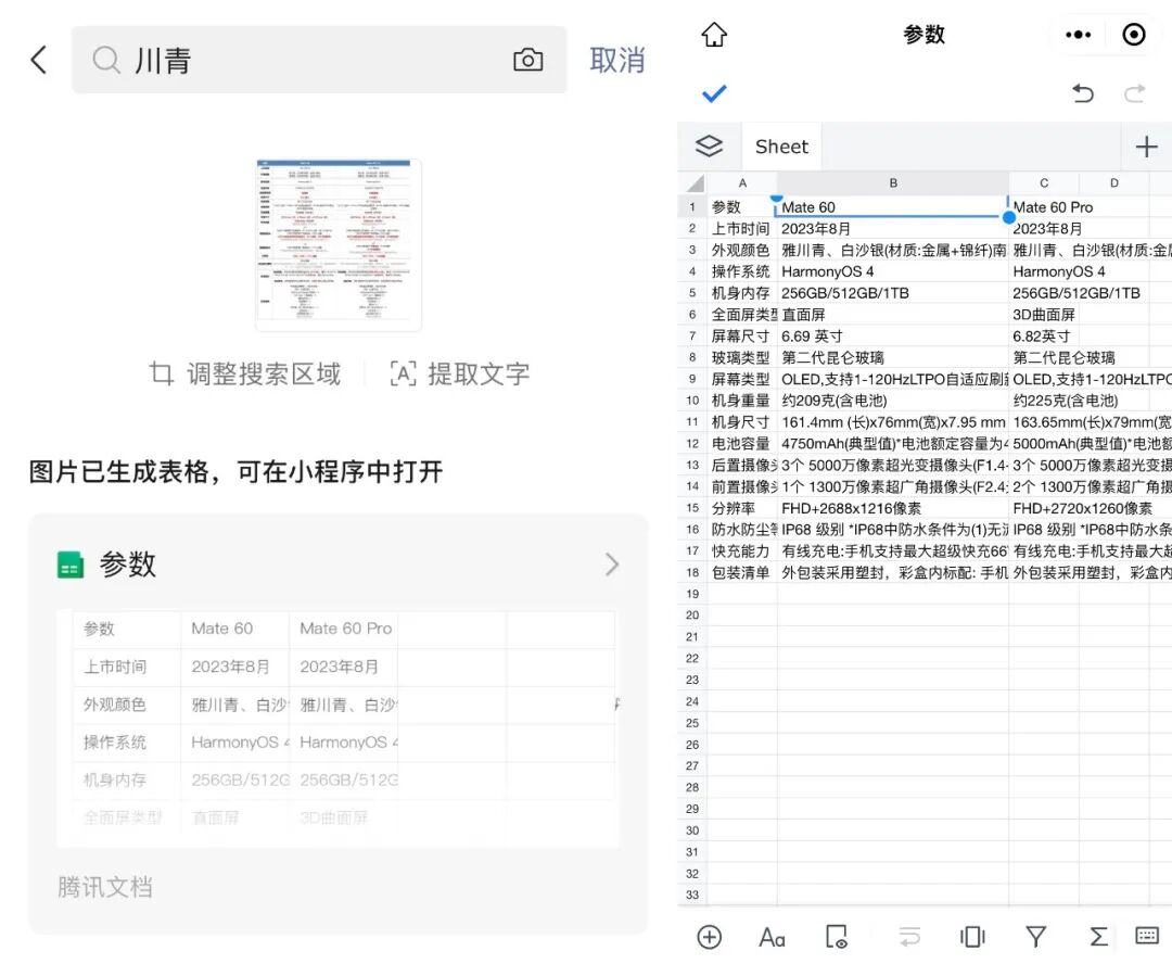 首先是微信图片可以生成Excel文件这个小功能,比如当对方给你发来一张新机参数表却是图片格式,像我这种平时更需要用文件格式使用的用户来说就很苦恼,这时轻按图片点“搜一搜”跳转会发现图片已经生成Excel表格,然后通过腾讯文档打开就能分享给自己文件打开。整体表格中的文字都和图片一致,就是单元格样式、字号颜色需要自己手动调整,还比较实用~