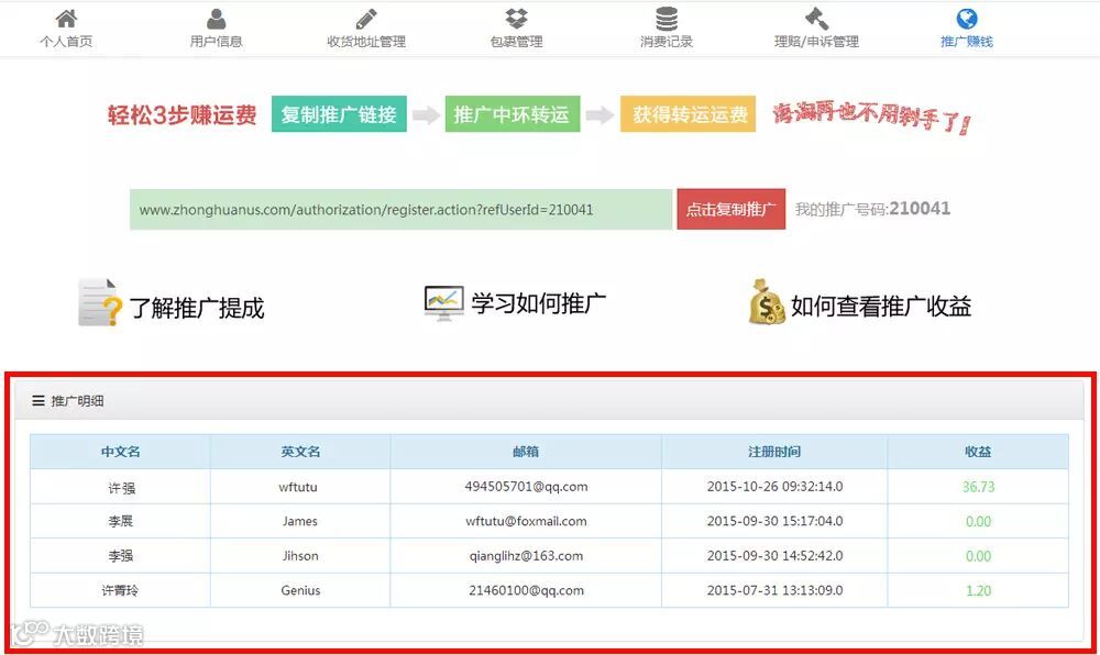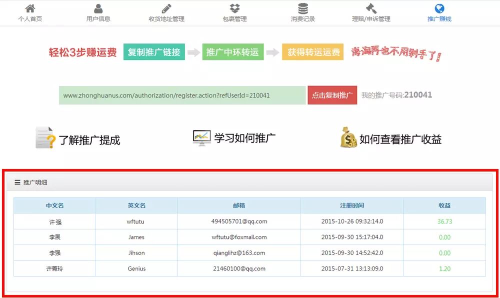 登录中环转运进入个人后台,“推广赚钱“页面即有推广收益显示,如图:(红框部分)