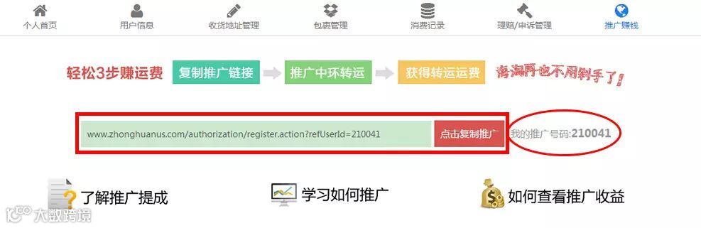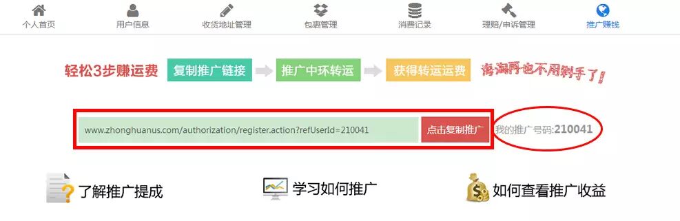 首先,我们要注册成为中环转运用户,然后登录中环转运进入个人后台,找到“推广赚钱”。如图