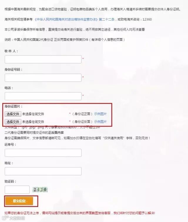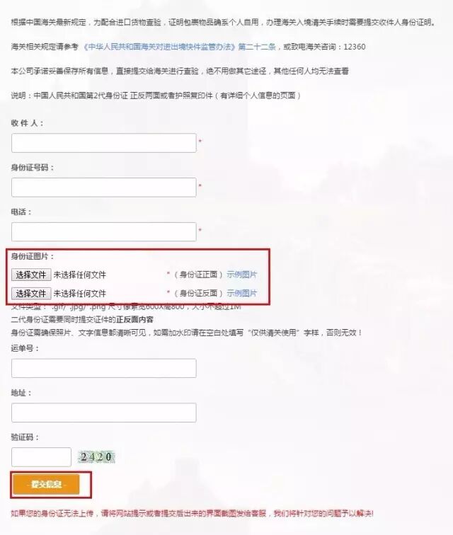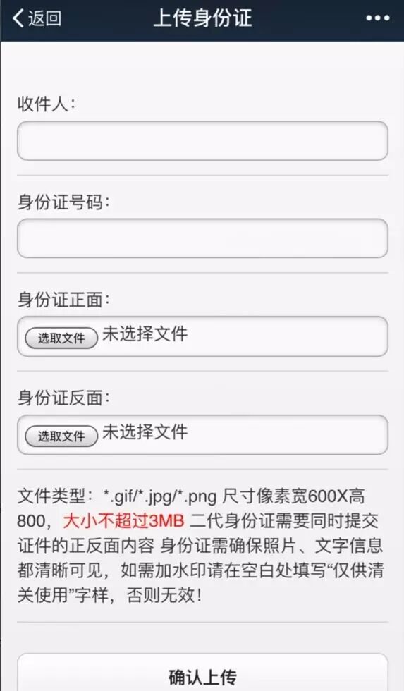 为了给大家提供更好通关服务,请务必在包裹寄出后24小时内,上传收件人的真实身份证正反两面。