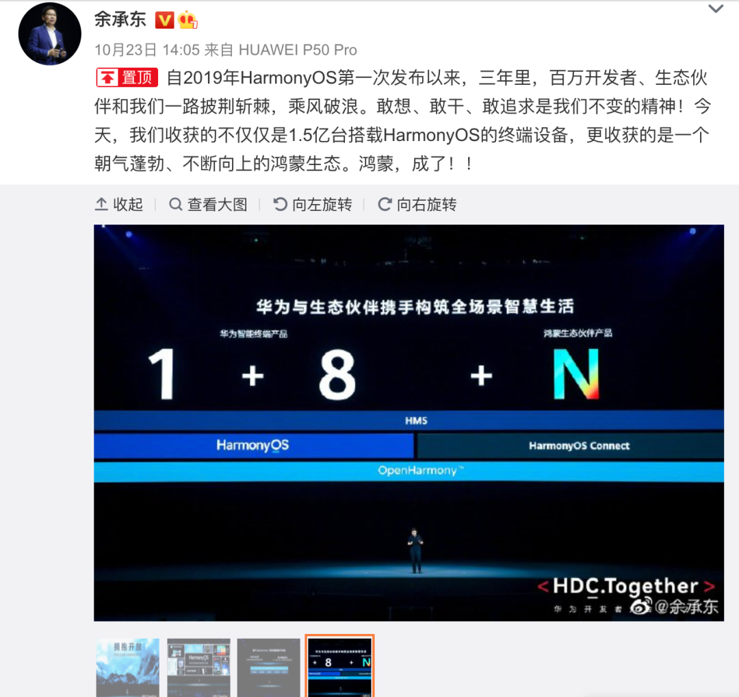 华为常务董事余承东也在微博发文表示:「自2019年HarmonyOS第一次发布以来,三年里,百万开发者、生态伙伴和我们一路披荆斩棘,乘风破浪。敢想、敢干、敢追求是我们不变的精神!今天,我们收获的不仅仅是1.5亿台搭载HarmonyOS的终端设备,更收获的是一个朝气蓬勃、不断向上的鸿蒙生态。鸿蒙,成了!」